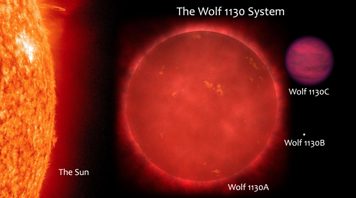Wolf 1130C所处的“三体”星系,及它们与太阳大小关系的示意图。左侧是太阳,Wolf 1130A是一颗红矮星,Wolf 1130B是一颗白矮星,在图中用白点表示。(亚当·伯加瑟供图)